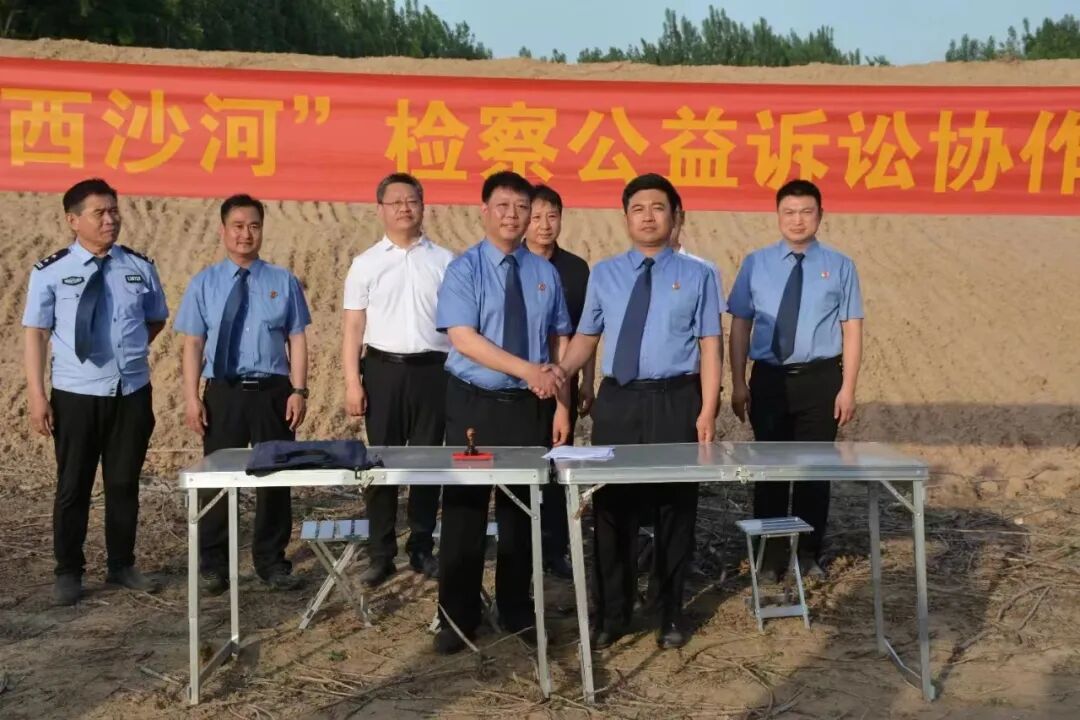 为深入开展“燕赵山海·公益检察”护航美丽河北建设专项监督活动,建立健全西沙河流域水环境保护检察公益诉讼协作机制,着力解决西沙河流域环境问题,共同护好水生态,打好碧水保卫战。5月15日下午,南宫市人民检察院与巨鹿县人民检察院在西沙河流域举行《关于建立“西沙河”检察公益诉讼协作机制的意见》会签仪式,南宫市人民检察院党组书记、检察长南海京和巨鹿县人民检察院党组书记、检察长孟宪荣出席会签仪式,南宫市、巨鹿县水务局主要负责同志和两地检察机关分管负责同志参加本次活动。 会签仪式上,两地检察机关签署了《关于建立“西沙河”检察公益诉讼协作机制的意见》,与会人员一致认为,双方在各负其责、因地制宜的前提下,全方位加强西沙河流域(南宫-巨鹿段)水环境保护跨区域协作,充分发挥检察公益诉讼职能,推动行政机关主动履职尽责,筑牢西沙河流域水环境保护跨区域联动防线。  协作机制会商期间,南海京检察长就我院办理的西沙河流域南宫段河道内种植高杆树木侵占河道一案情况,现场向南宫市水务局主要负责同志送达了检察建议书。
