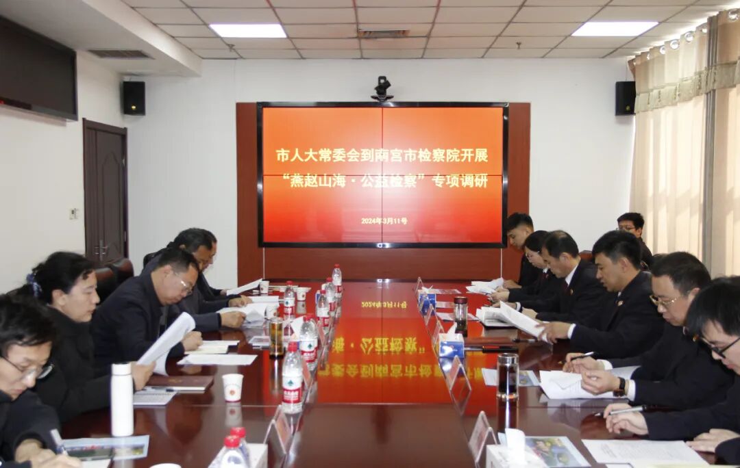 为全面推进“燕赵山海·公益检察”护航美丽河北建设专项监督在南宫落地生根、开花结果,3月11日,南宫市人大常委会主任傅学磊,副主任郭京发带领部分委员和人大代表,到南宫市检察院听取“燕赵山海·公益检察”护航美丽河北建设专项监督汇报。党组书记、检察长南海京参加调研。