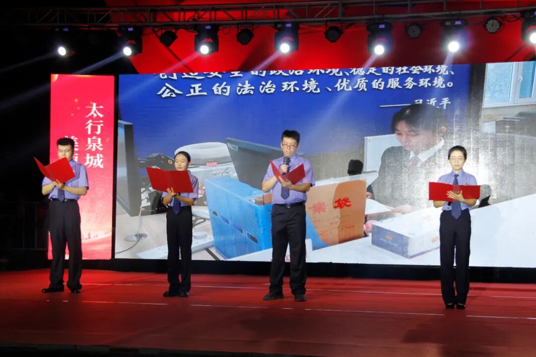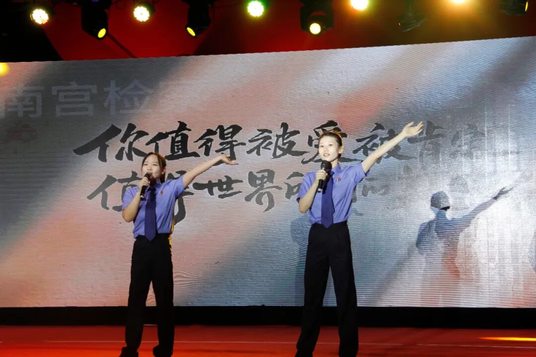 活动在歌舞《五星红旗》表演中拉开帷幕;歌曲《敢问路在何方》鼓舞着群众在生活中敢于探索、不懈追求,相信《阳光总在风雨后》;戏歌《说唱脸谱》弘扬中华民族的传统文化,开启文化发展《新的天地》;伴随着《夏日里的滴滴声》,通过检察原创《听歌防诈骗》将法律知识传播开来,用轻松的方式让现场群众了解电信诈骗的危害,提高面对诱惑的警惕心;诗朗诵《检察颂》《我爱你,中国》《强国力量》更是展现了新时代政法系统工作者不忘初心、牢记使命和奋发有为的精神面貌,展现政法干警“司法为民,公正司法“的坚定决心,将整个晚会推向高潮。